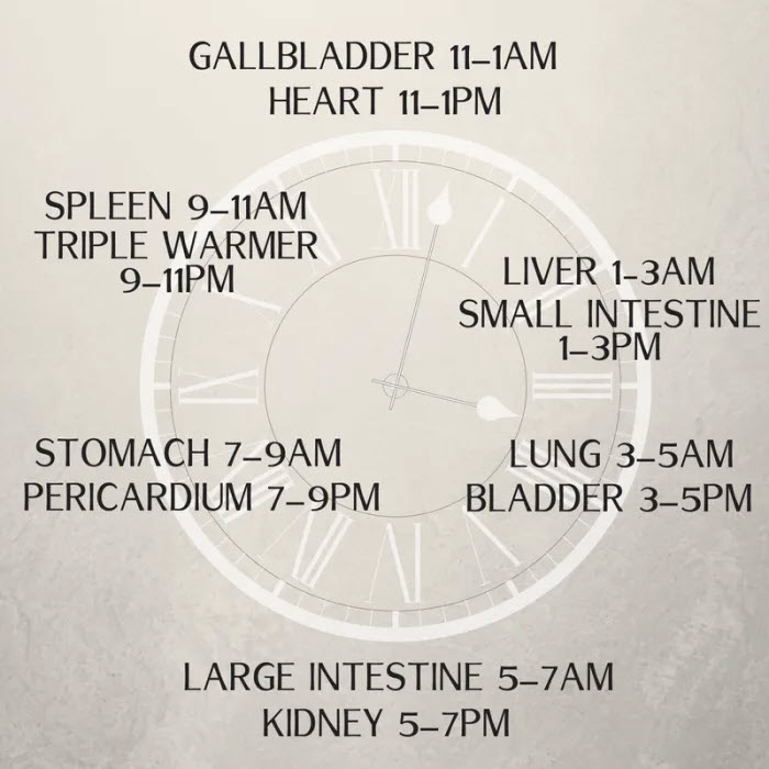 The Meridian Clock, also called the Chinese Body Clock, is a tool used to understand the flow of Qi (Chi) throughout the 12 meridians in the body. Qi is believed to circulate along these 12 primary meridians. According to Traditional Chinese Medicine (TCM), each meridian has a two-hour window during the day when it is most active, and Qi reaches its peak in that specific meridian. During this time, the related organ also functions at its highest level. This cycle repeats every 24 hours.