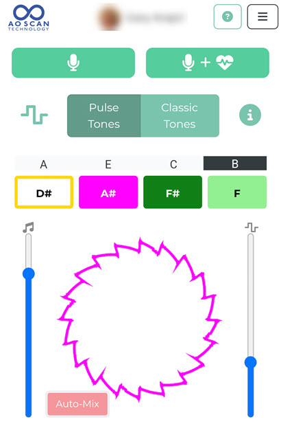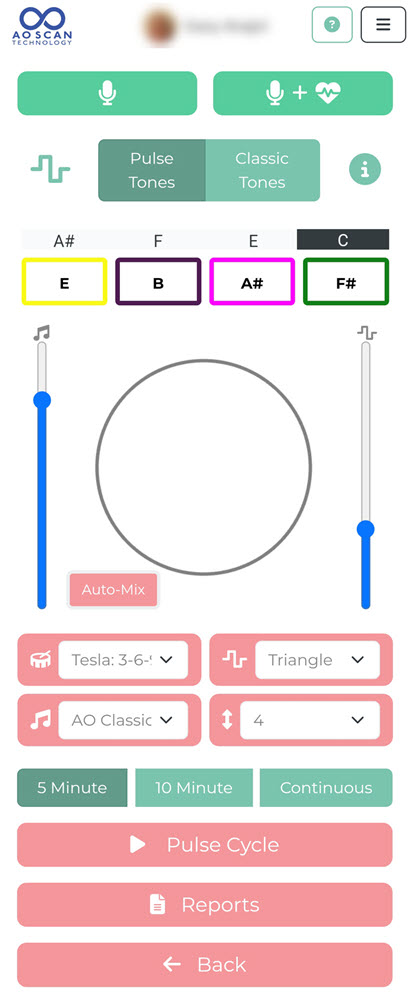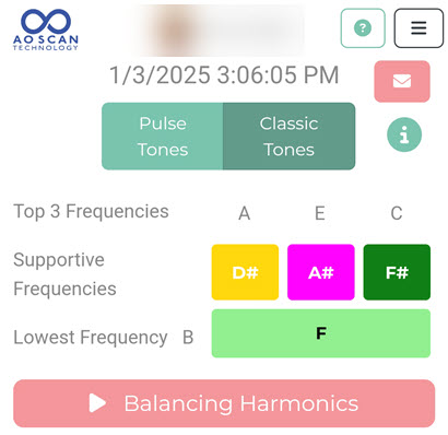 The Classic Tones button will analyze approximately 2000 frequencies. The AO Scan will display the three frequencies with the highest and lowest out-of-range frequencies. Then, it will give you some basic information on those tones. Each tone you wish to hear lasts for 3 minutes when you listen to the tone.
