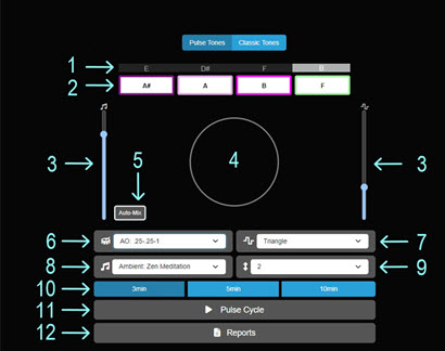 There will be times when you conduct a scan and notice that one of the tones that was out of range is actually the balancing tone for another tone that is within range. Don’t worry about it. Your body will naturally apply these frequencies where they are needed, much like a mailroom operates. Imagine you throw all the mail into a large sorter, and it organizes the deliveries to the correct carriers. The same concept applies here: even though a particular frequency may be out of range in one area, it can still be essential for balancing another area. Pay attention to the tones that serve as your balancing frequencies; your body knows what needs to be done with them. - Left Slider controls the music volume. Right Slider controls the Supportive Frequency volume. These are volume controls for the Music and the Tones. Now what this does is different from Classic Tones. You are now able to mix the volumes. Whereas the Classic Tones were already premixed for you, these slider controls now allow you to bring the music and tones up a little bit more if you want, or to take them down a little bit more. This is just preference. If you take the Note volume all the way down and play just the Music, you just wasted your whole inner voice time because the magic is the notes, so you want to make sure you can hear the notes.