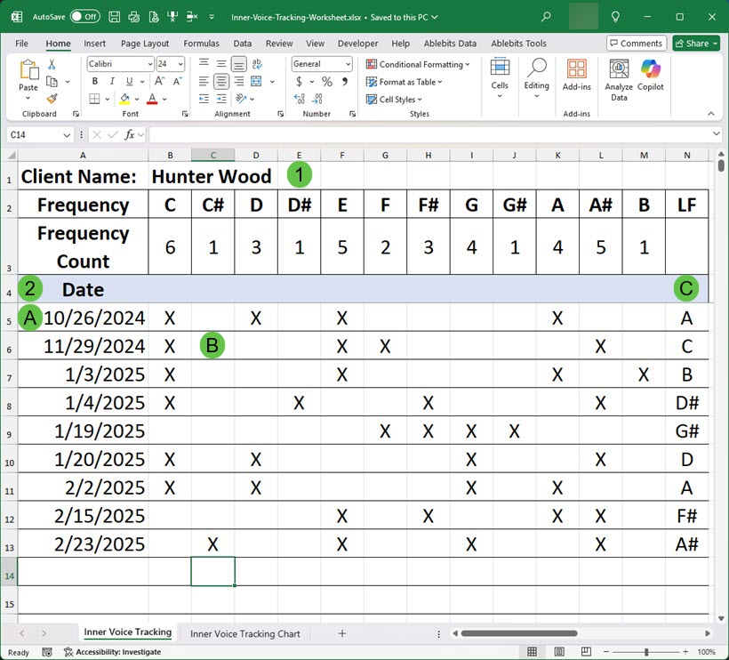 - This worksheet visualizes the Inner Voice high and low frequency data and shows patterns and trends at a glance, making data analysis straightforward and intuitive.
